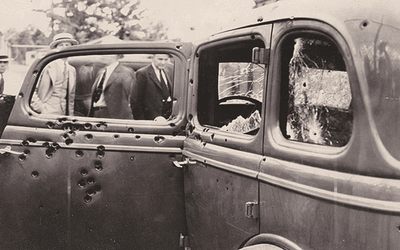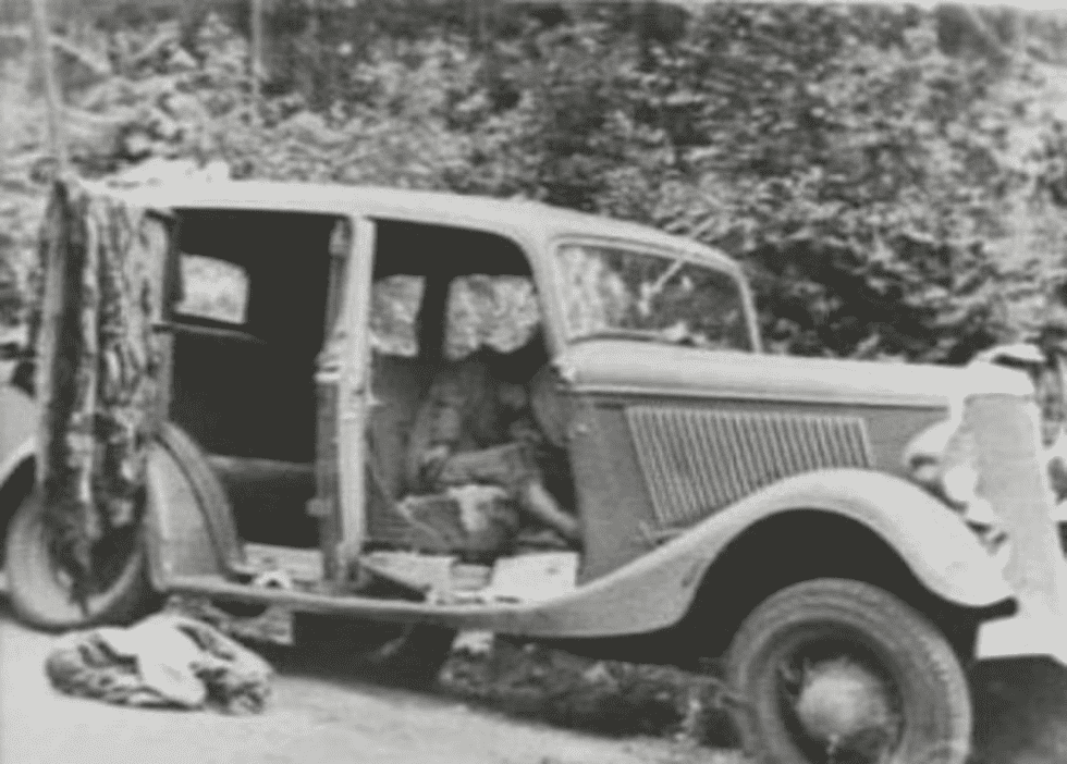 On May 23, 1934, Louisiana state troopers laid a deadly ambush. They used former associate Henry Methvin as bait. When Bonnie and Clyde drove up, the officers unleashed over 130 rounds into their stolen Ford V8. The pair died side by side in the car. Officers recovered an arsenal of weapons, thousands of rounds of ammo, and fifteen sets of license plates.